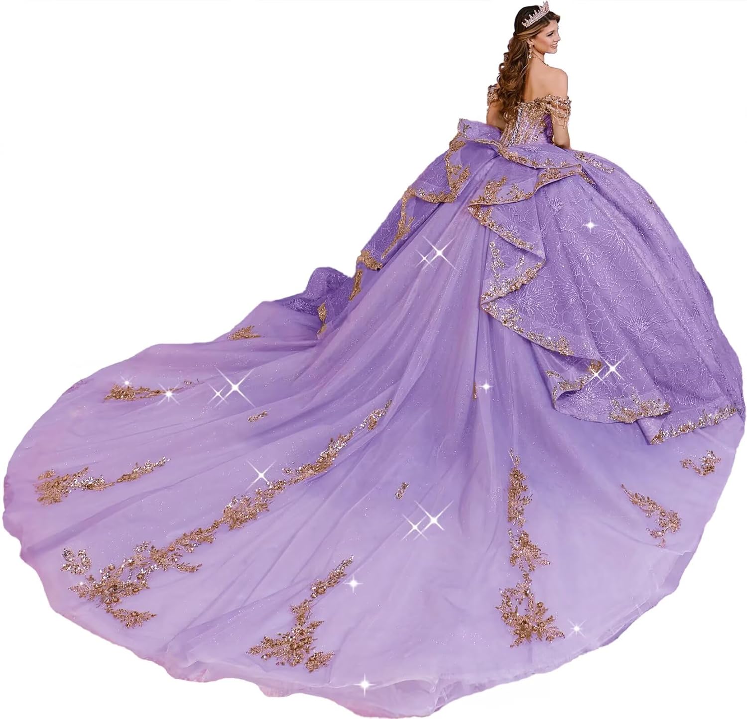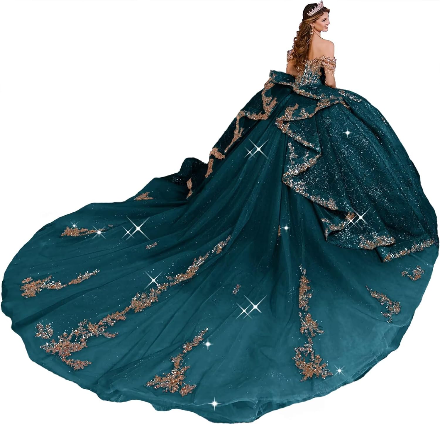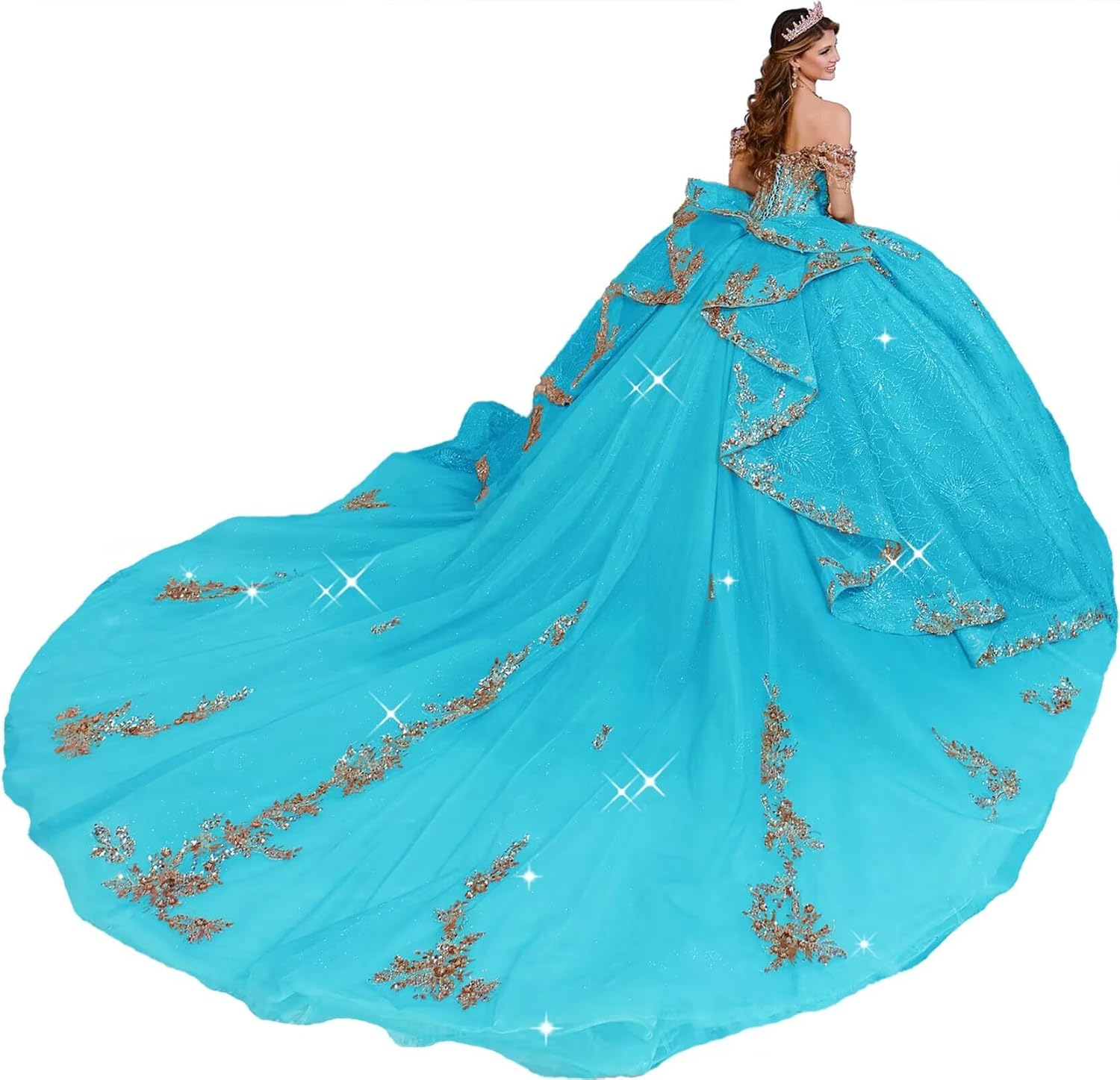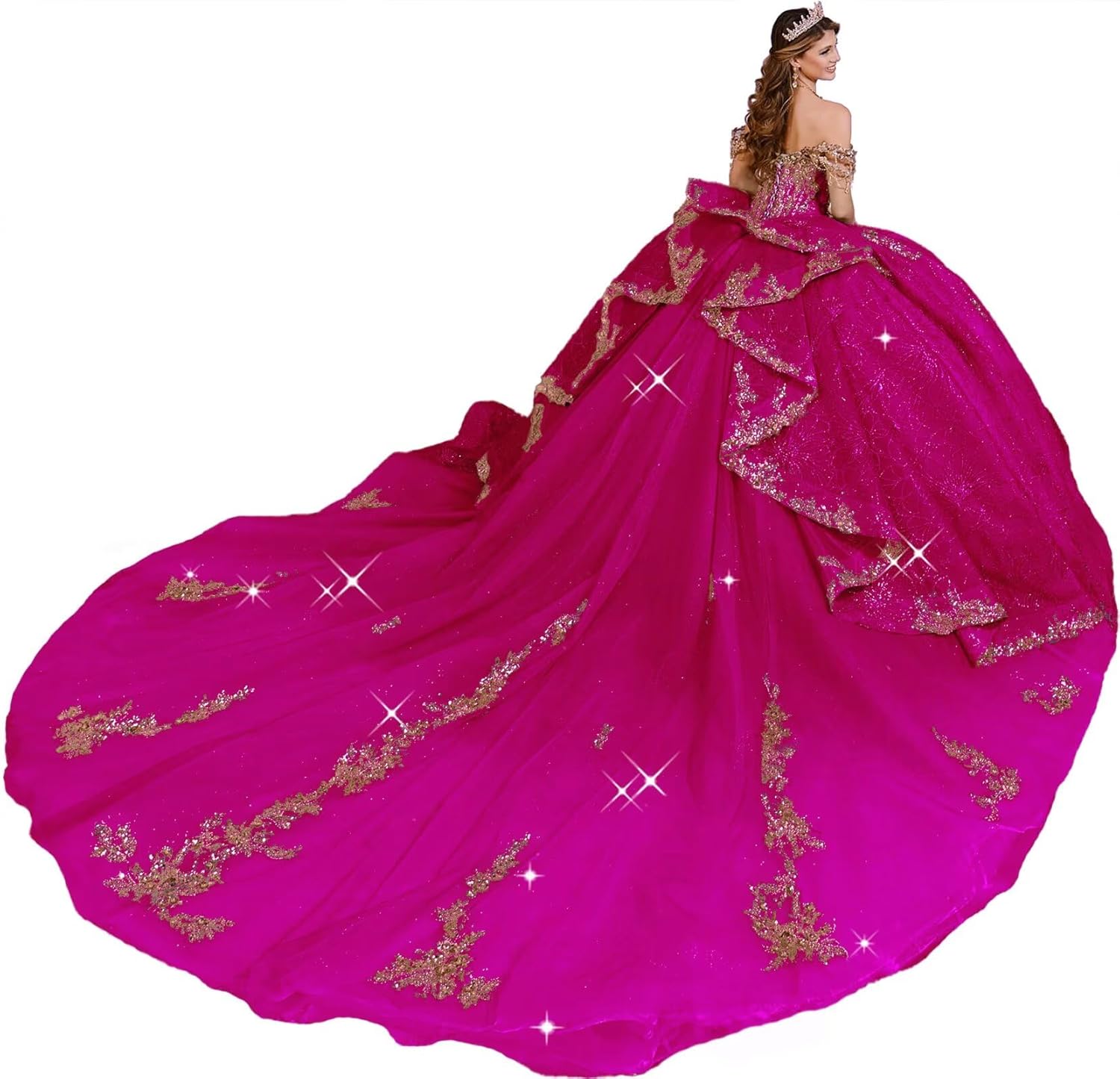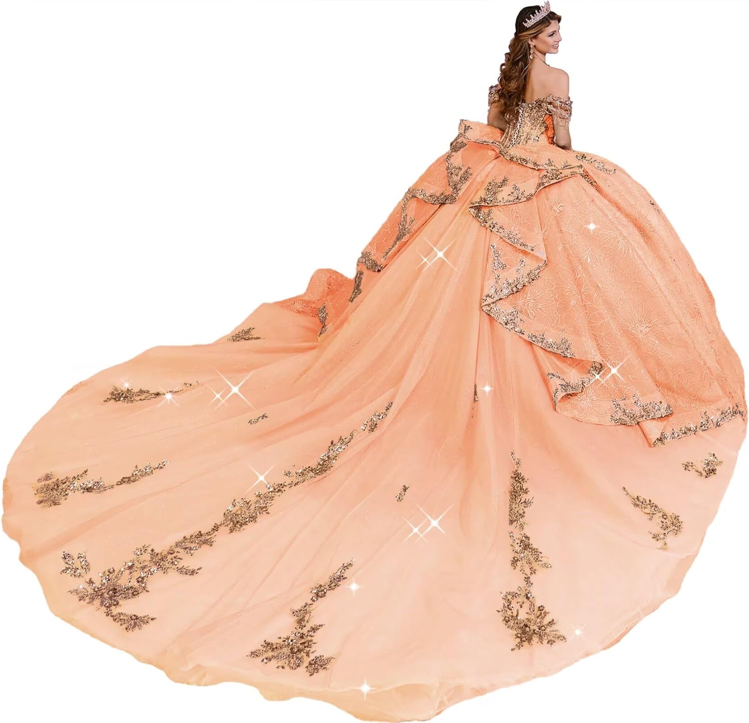 | Embellishment Feature | Bow, Gold Appliques, Off Shoulder, Sparkly Beaded Diamonds, with Long Train |