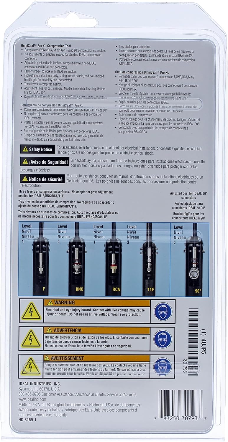 Our flagship OmniSeal Pro XL (30-793) compression tool is compatible with and terminates all IDEAL compression connectors. Patented dual spring clips and fixed top ledge enable this tool to compress more connectors than any other tool on the market. Unlike most compression tools which require adjustments and adapters for each type of connector, this compact 6¾“ length tool compresses all straight IDEAL compression connectors with no adjustments to the tool. F/BNC/RCA/RG-11 F connectors can all be terminated one after another with no setting changes. Only the 90° F and BNC connectors require a tool adjustment. An adjustable spin knob allows for compressive forces to be placed on the rim of the connector instead of the bottom of the nut when required. This is helpful for non-IDEAL plastic centered connectors such as 50Ω BNC‘s or RCA‘s with limited structural support. It can also be used as a larger flat surface to compress against for other types of non-traditional compression connectors. The adjustable post and spin knob, combined with three compression surface levels, give the installer virtually unlimited options for compressing current and future connector designs.