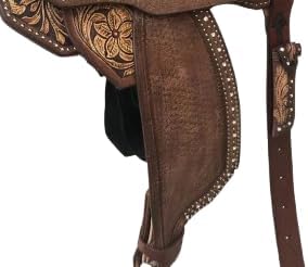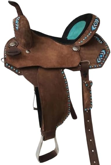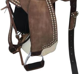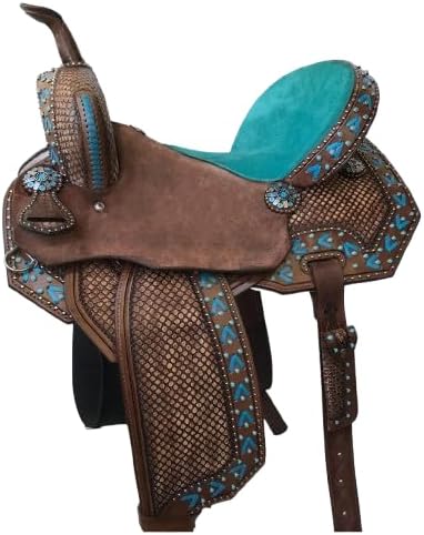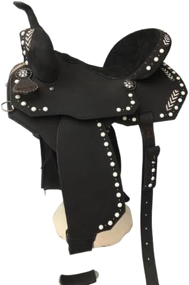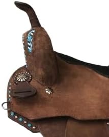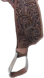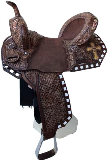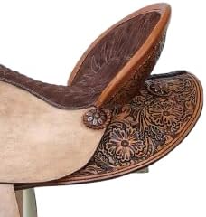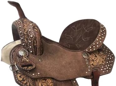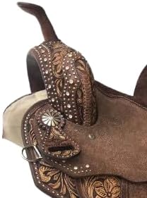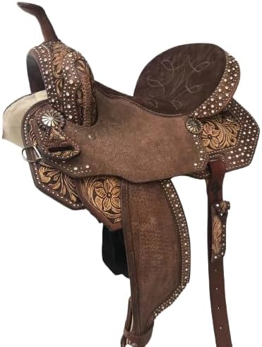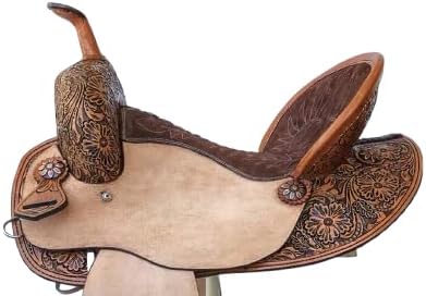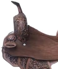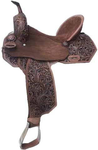 AD Saddlery Western Barrel Racing Wooden Tree Horse Saddles Handmade Premium Leather Comfort for Horses Trail Equestrian Tooled Carved Horse Saddle for Riding Size: 10"-18" inches Seat Available Experience the timeless appeal of a classic saddle. Crafted with meticulous attention to detail, this saddle is designed to provide both rider and horse with optimal comfort and support. The high-quality leather construction ensures durability and longevity, while the ergonomic design promotes proper positioning and balance. Whether you're hitting the trails or competing in the show ring, this saddle will become your trusted companion, allowing you to ride with confidence and style. With its sleek lines and traditional aesthetic, it's a sophisticated choice for equestrians of all levels. *** Girth Cinch, Back Cinch, Saddle Pad, and Horse Bit NOT INCLUDED *** Saddles are an essential piece of equipment for any equestrian, providing the crucial connection between rider and horse. Crafted with care and precision, a high-quality saddle offers comfort, support, and control for both the rider and the animal. Whether you're a seasoned competitor or a casual trail rider, finding the right saddle can make all the difference in your riding experience. With a wide range of styles and materials available, from classic English to rugged Western designs, there's a saddle to suit every discipline and preference. Invest in a well-made saddle, and you'll enjoy countless hours of enjoyable and secure riding adventures. Premium Quality leather Soft Fleece Underside, Fully Hand Carved. Beautiful Floral Weave Leather Design on Pommel, Cantle, Skirt, Fender, Stirrups, "TOOLING - FULLY HAND TOOLED FLORAL DESIGN ", Soft fleece underside. Our horse tacks are built on strong wooden trees which will have less pressure on your horse's back and provide rider comfortable seating. 100% authentic handmade saddle. Expertise in all equestrian products, each product in our store goes through stringent quality check and are handmade. This premium all-around barrel saddle is perfect for any discipline whether you are turning and burning at the rodeo, or out for a leisurely trail ride! This saddle features a comfortable, thickly-padded Leather seat that will grip you into the seat when going around the barrels. The saddle also features numerous ties for accessory attachments, such as saddlebags, for when you are out on the trail or around the ranch. The saddle has a classic studded trim around the edges for added appeal, along with shiny silver sun conchs that make this saddle stand out from the rest. The well-padded fleece underside ensures your horse stays comfortable while helping to eliminate pressure points. Saddle Measurements & Specifications - Color;- As Per Picture Gullet-: 10": 5.5"; 12 to 13": 6.5" 14 to 18" 7" FQHB. Skirt-: 26.5”, Horn-: 3”, Swell-: 12.5”, Cantle-: 4.5”, Stirrups-:28 - 38”, Weight-: 26 LBS